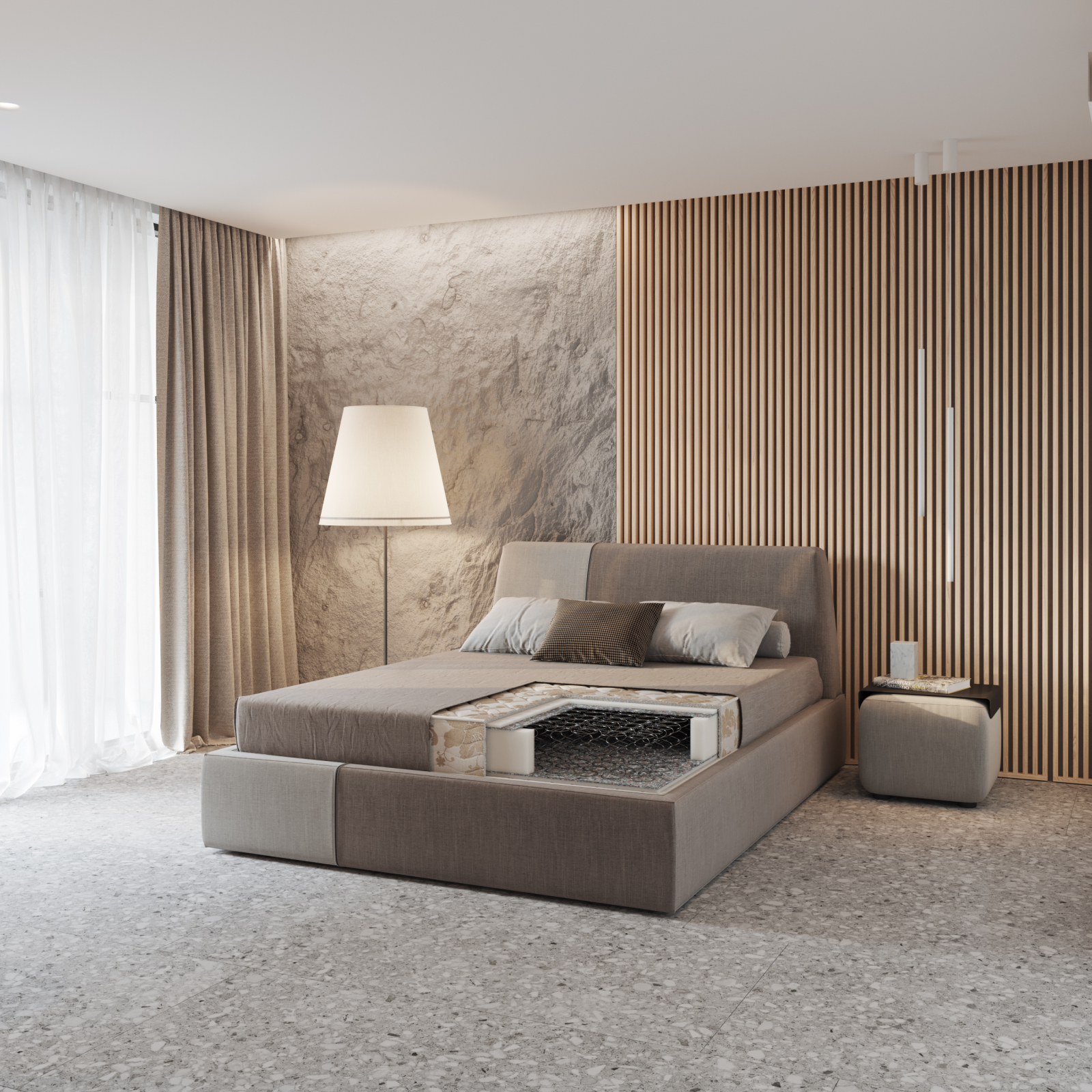 Husă: material din bumbac matlasat pe întreaga suprafață cu lână și bumbac, cu tratament antialergenic și antibacterian. Materialul textil folosit are certificare ecologică și sanitară OEKO-TEX 100